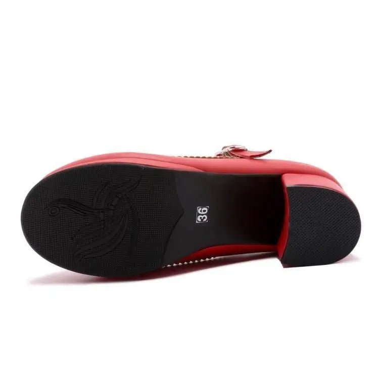 - Options include a rounded toe version featuring a heart buckle, a T-Bar strap version, or a pointed toe version.