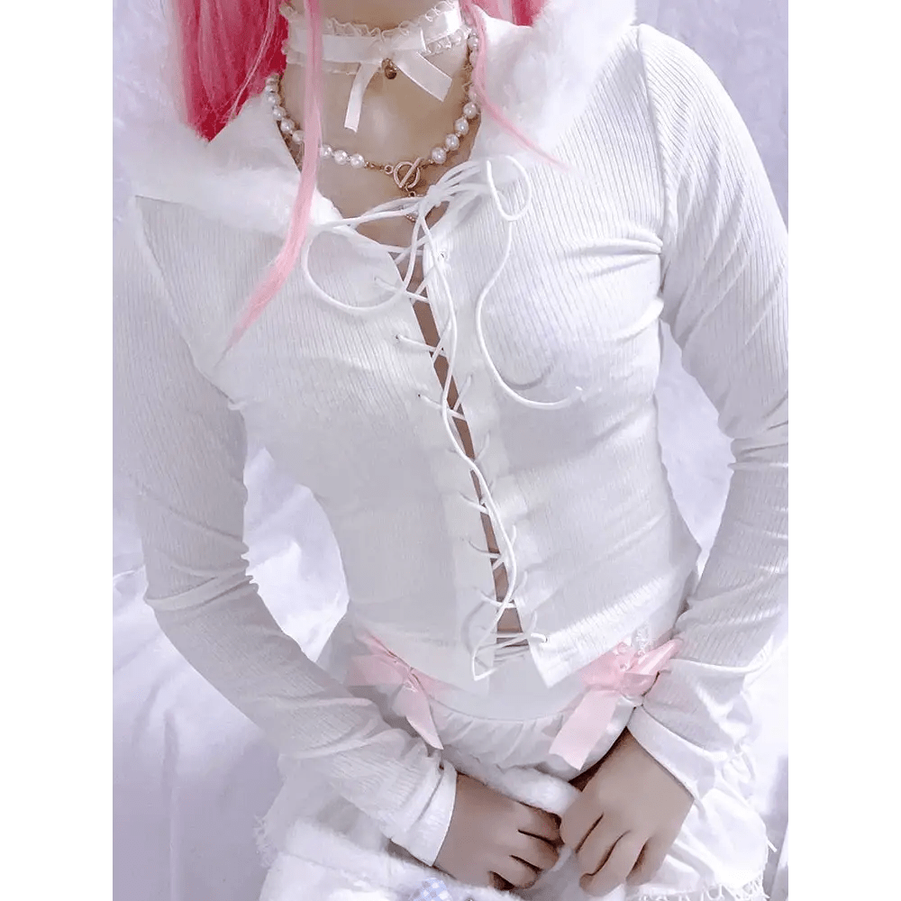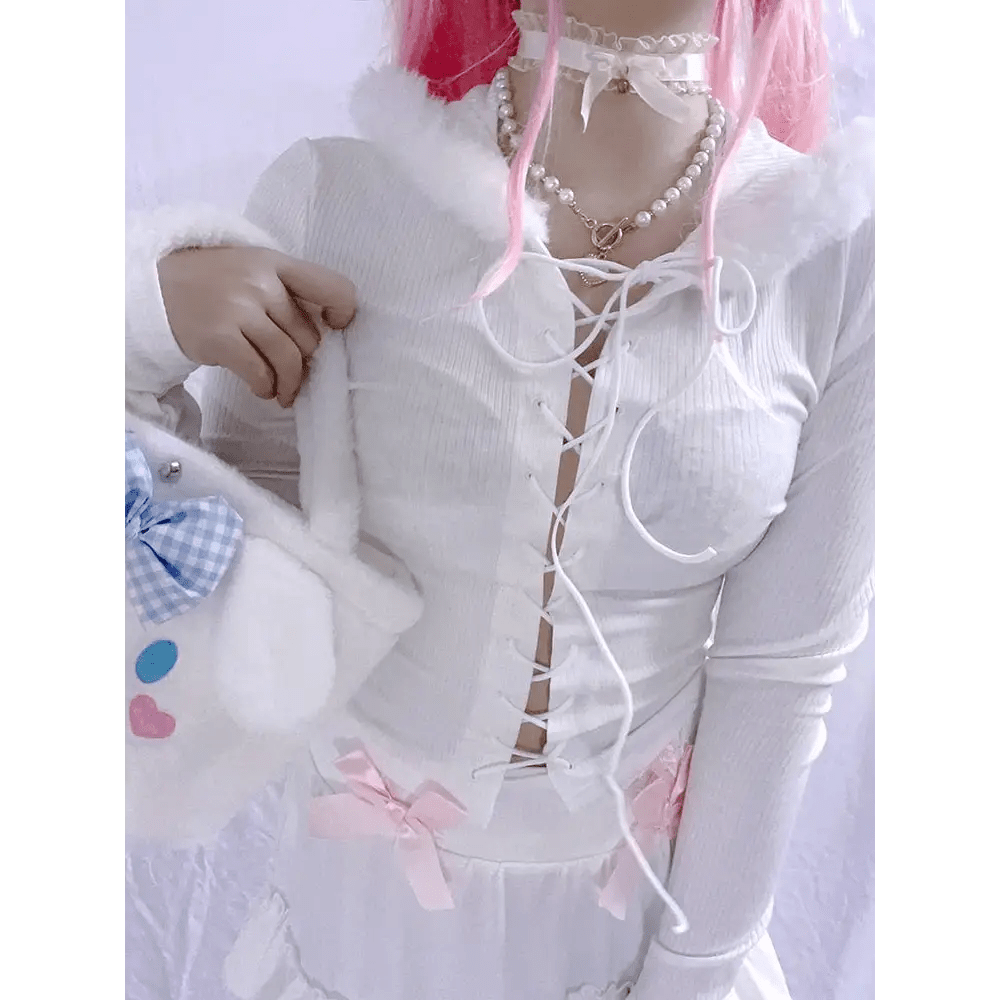 - The Lace Up Fur Hooded Cardigan is the perfect addition to your angelcore or fairycore wardrobe.