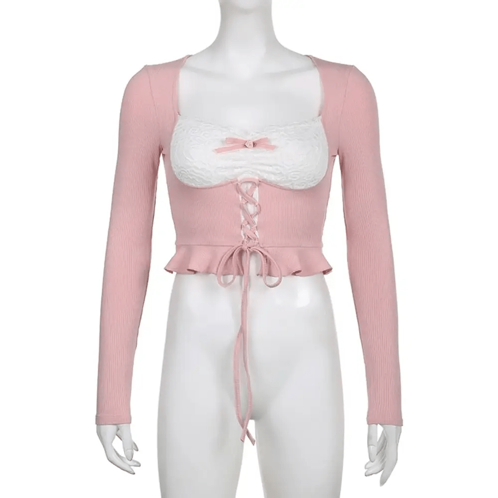 - The white lace embellished upper and pink silk rosebud ribbon on the chest give off a nymphette and princess vibe, while the frilly trim all over adds a touch of femininity and delicacy.