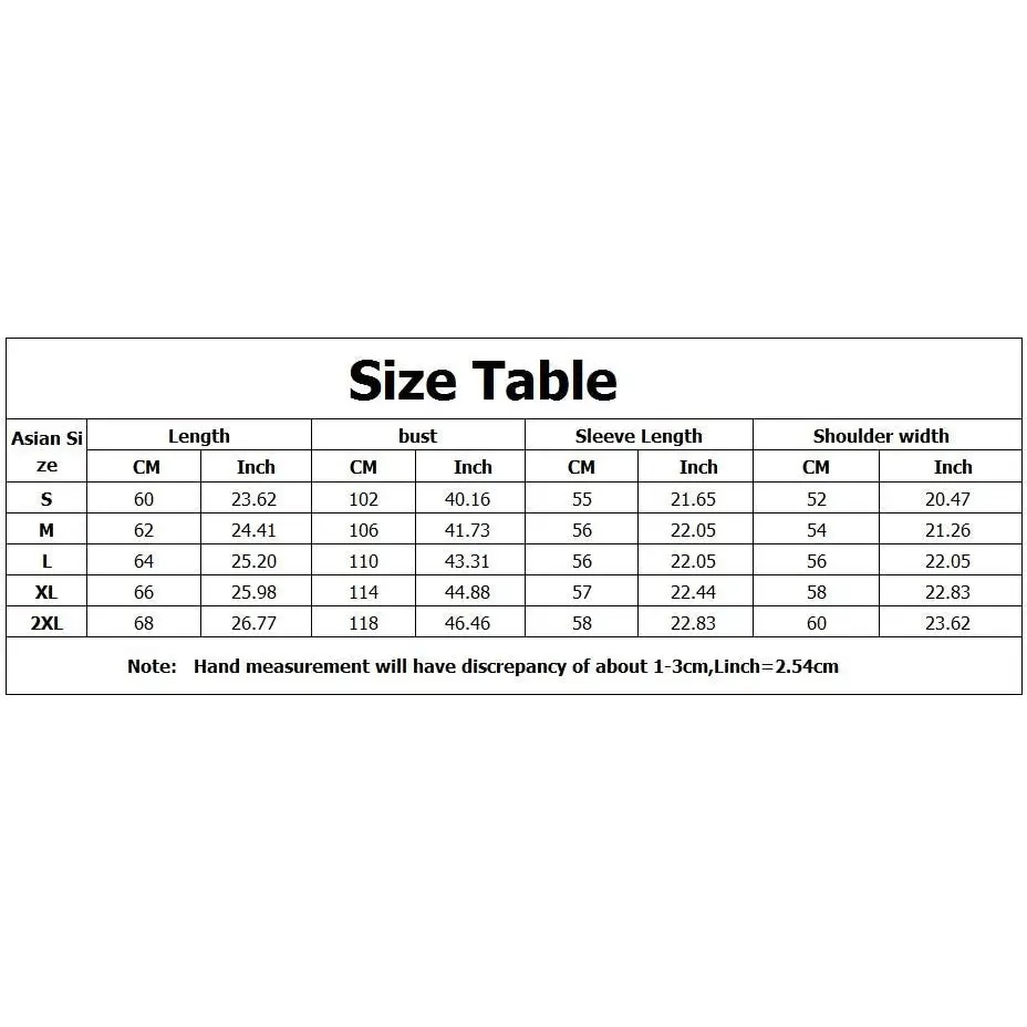 Size Shoulder Bust Length Sleeve S 56cm 112cm 62cm 50cm M 58cm 116cm 64cm 52cm L 60cm 120cm 66cm 54cm XL 62cm 124cm 68cm 56cm 2XL 64cm 128cm 70cm 58cm