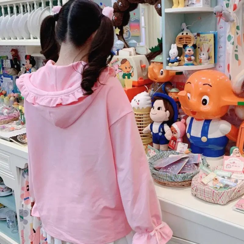 Show off your unique style with the kawaii pink bunny ice cream design, complete with ruffled sleeves and a cozy drawstring hood. Made from a soft and comfortable cotton blend, this hoodie is perfect for all-day wear.