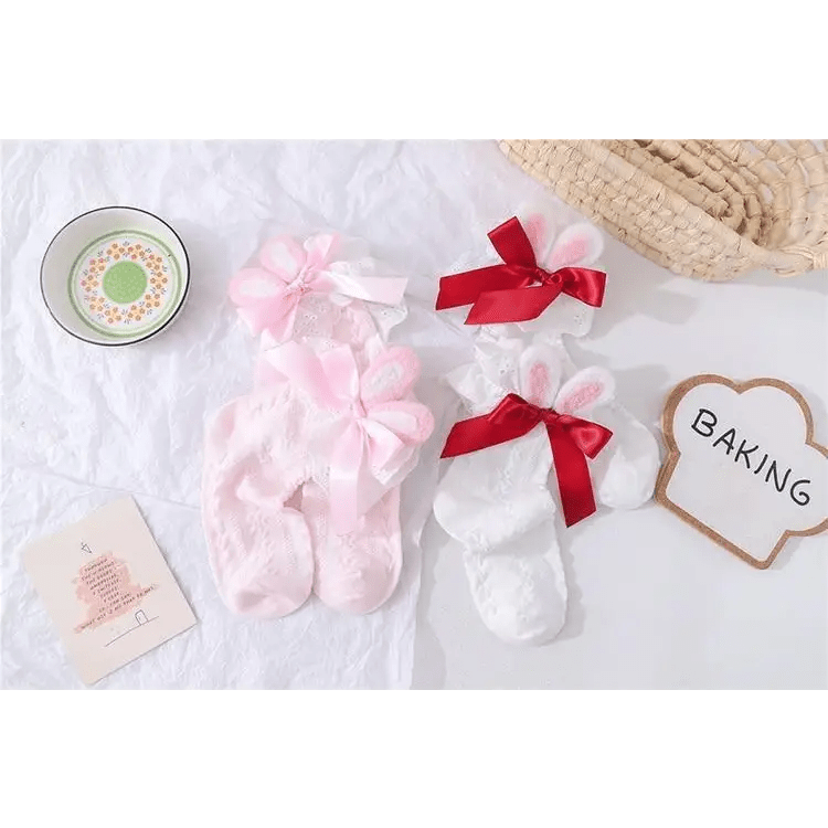 - Indulge in ultimate dainty Lolita vibes with these stunning lace bunny ear Lolita stockings, showcasing elegant doily ruffles on the top and removable bunny ears adorned with a silky red ribbon. Influenced by adorable baby buns, these stockings exude the girliest essence of kawaii fashion!