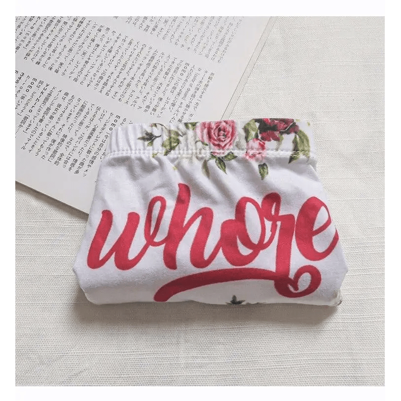 - These undies feature an array of gorgeous flowers all over, with the word "WHORE" written across the front in beautiful elegant cursive writing.