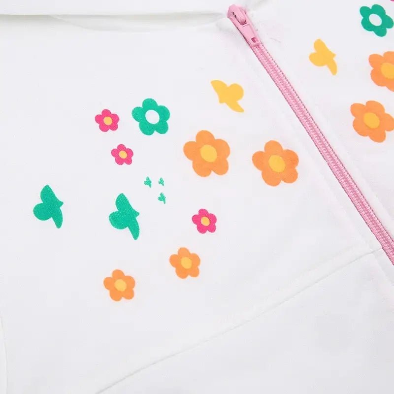 - The jacket features a white long-sleeve hooded design with a zipper closure and cute 90s-inspired flowers on the upper chest.