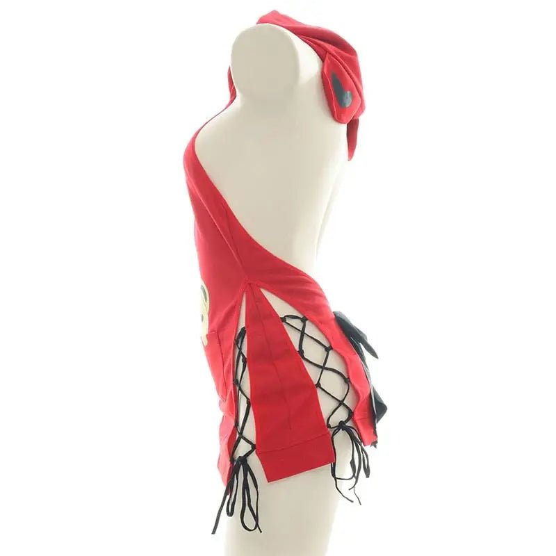 - The seductive scoop open back is adorned with a large black bow on the bottom.