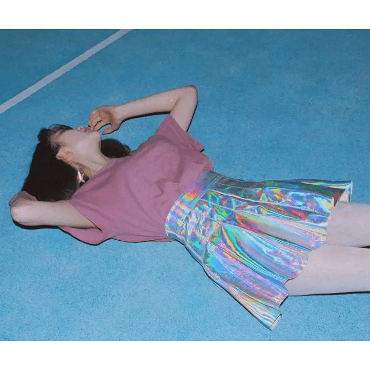 - A stunning holographic pleated silver mini skirt! Very on trend J-Fashion and K-pop fashion.