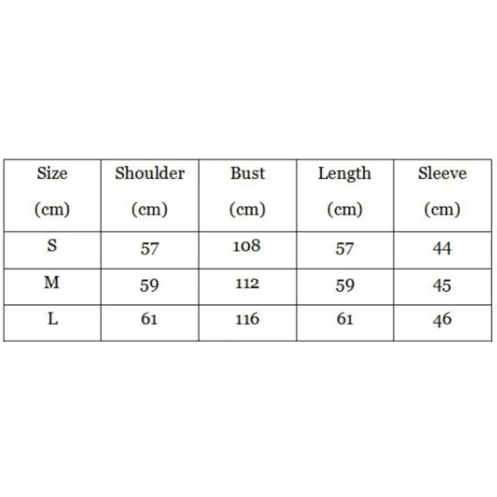 | Size | Height (cm) | Chest (cm) | Waist (cm) | Hips (cm) |