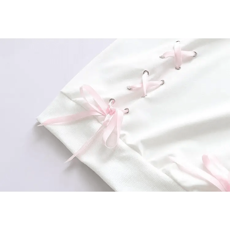 - Cute corset style lace up ties along the sides with sweet ribbons!