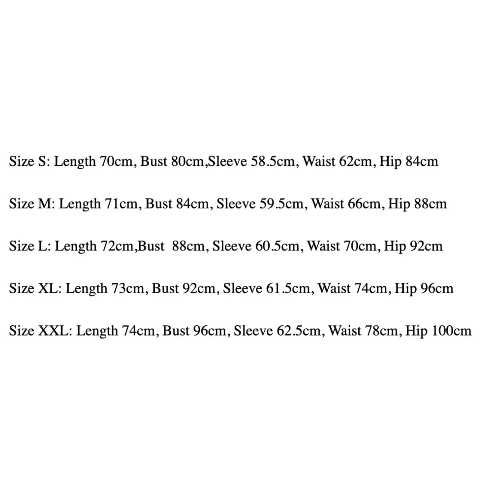 | Size | Height (cm) | Chest (cm) | Waist (cm) | Hips (cm) |