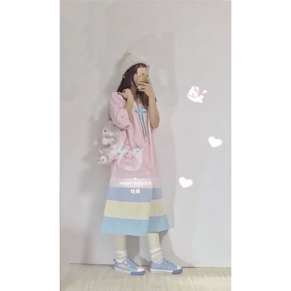 - The shoes are designed to resemble classic children's shoes, featuring a rounded toe, soft pastel colors, and a blue striped fabric.