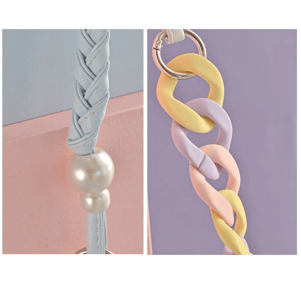 - The option to choose between a chunky rainbow oversized chain strap or a dainty pearl strap to match your aesthetic style
