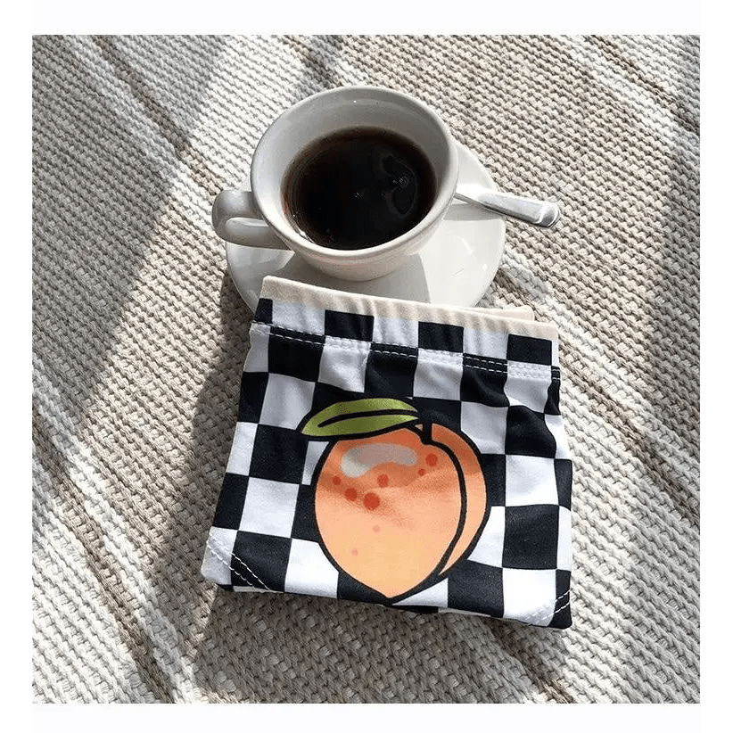 - Featuring a bright black & white checkerboard pattern all over with a juicy ripe peach on the front with a matching peach waist band - what's not to love?