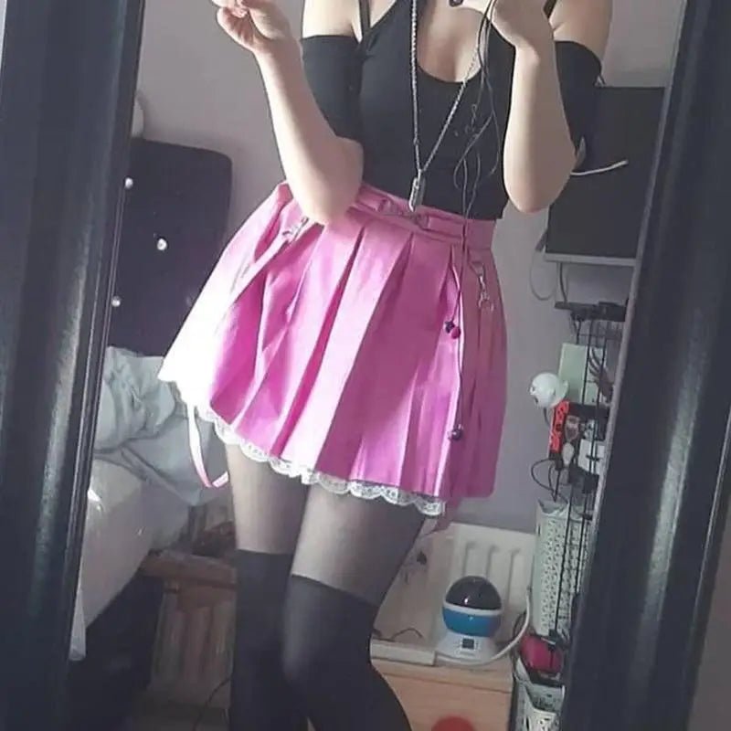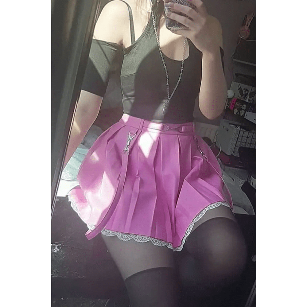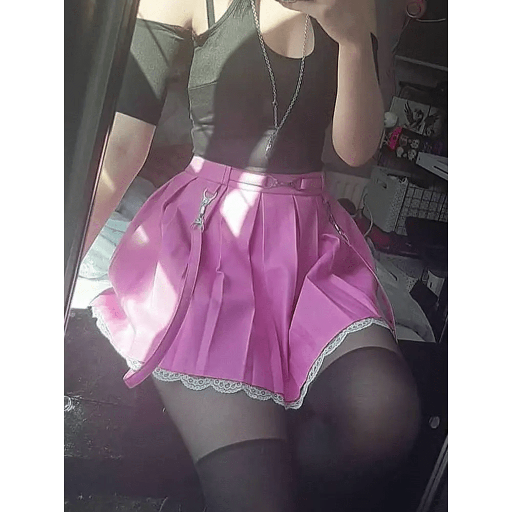 - This sweet candy colored pleated skirt has gorgeous white lace tulle along the bottom hem, and high quality metal buckle details!