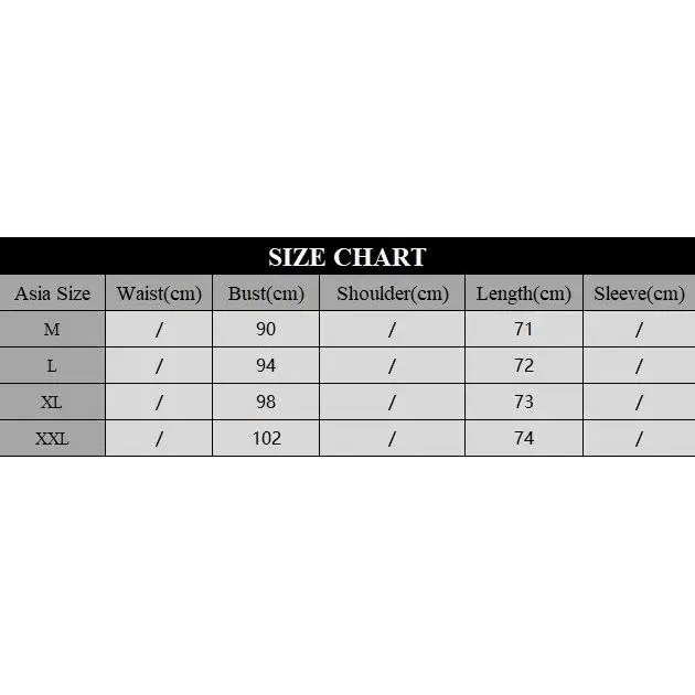 | Size | Height (cm) | Chest (cm) | Waist (cm) | Hips (cm) |