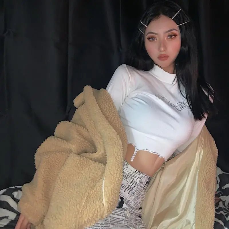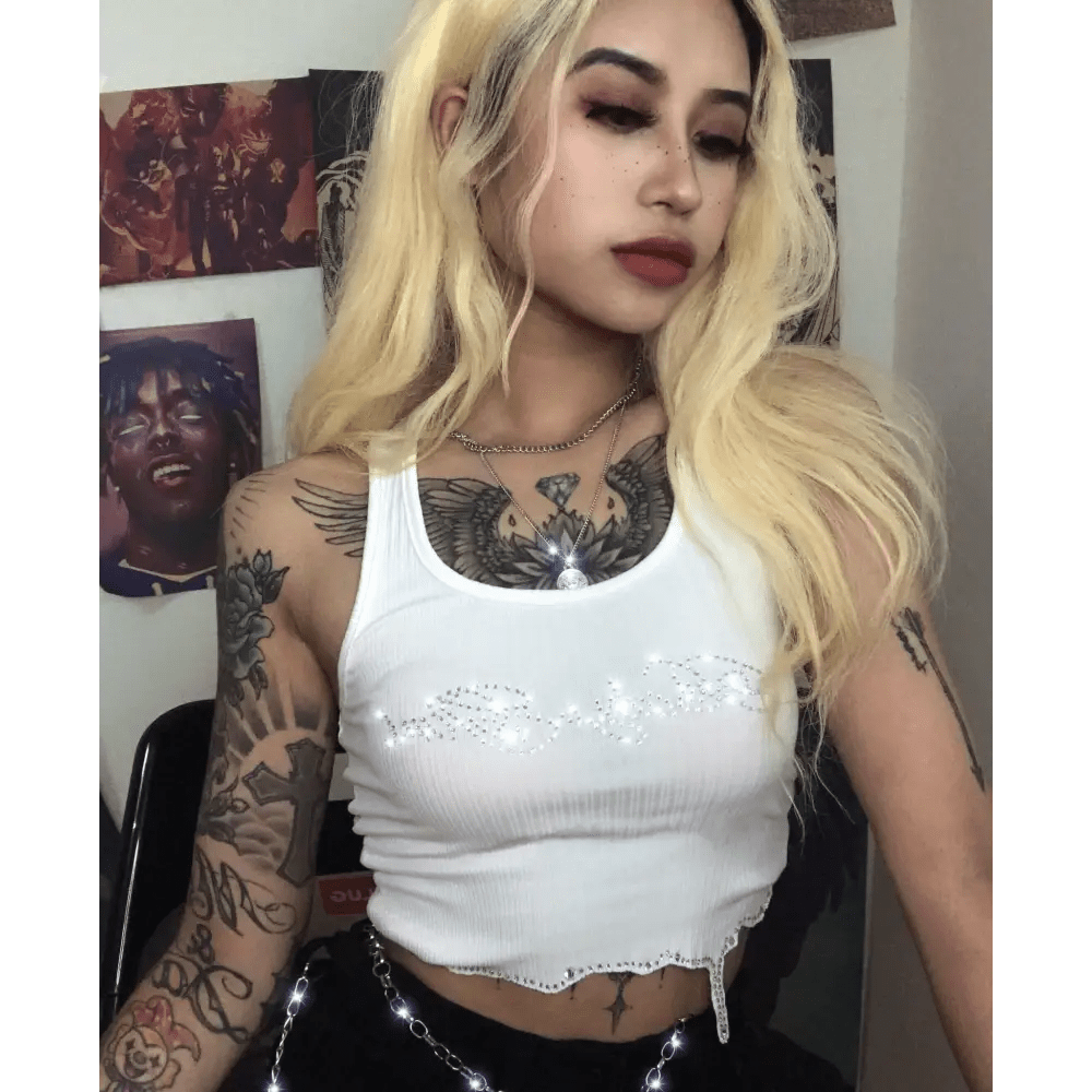 - This gorgeous textured knit drippy rhinestone embellished babygirl crop top is a must have for any glamorous Cosparty!