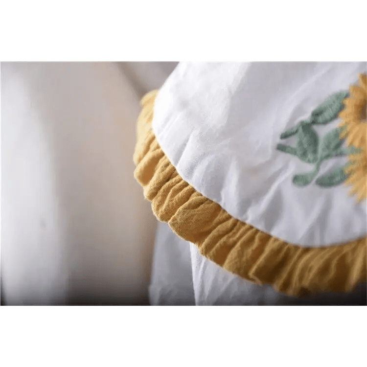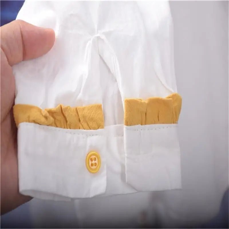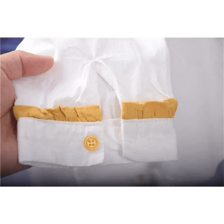 - With a light, airy, and bright white fabric, with quality hand-embroidery, peter-pan collar, and sweet yellow button & ruffle accents, what's not to love about this gorgeous white blouse?