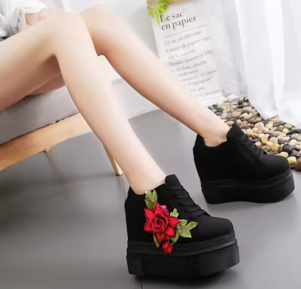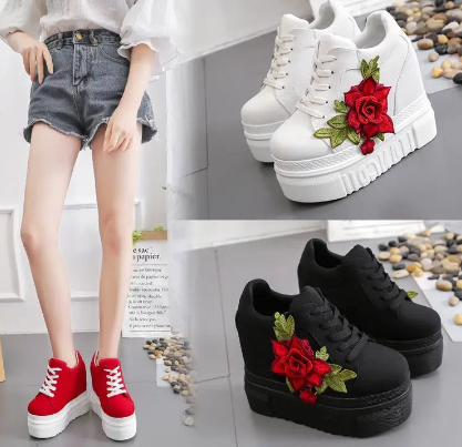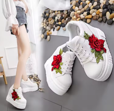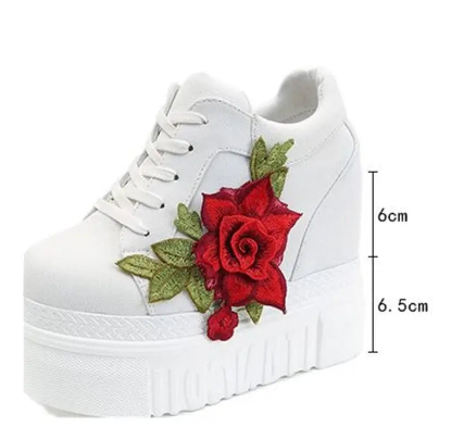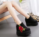 Red Rose Embroidered Chunky Wedge Platform Sneakers