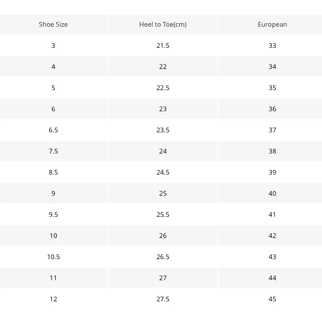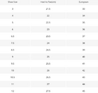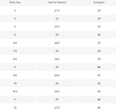 | EU | US (Women) | US (Men) | UK | Foot Length (cm) |
