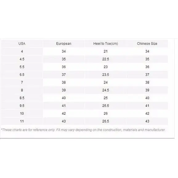 | EU | US (Women) | US (Men) | UK | Foot Length (cm) |